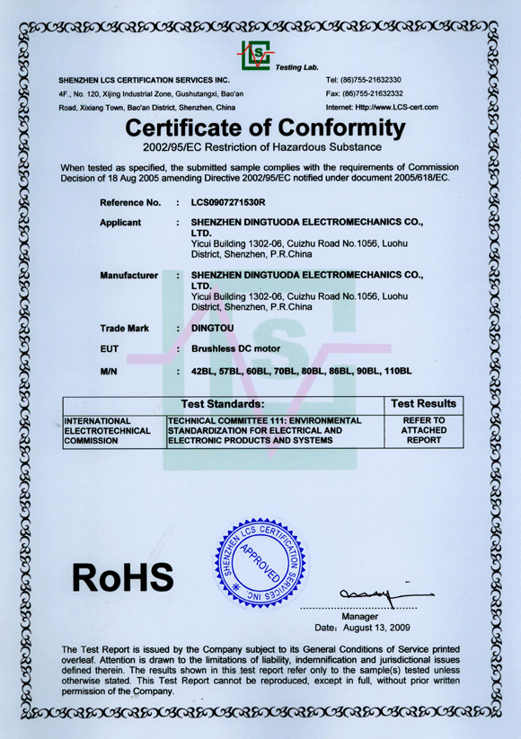 首頁->產品認證->無刷電機RoHS認證證書